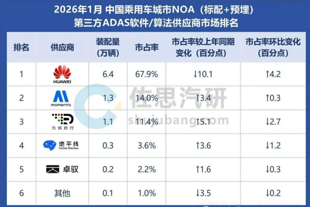 据佐思汽车研究最新报告,2026年1月,中国乘用车城市NOA(标配+预埋)装配量达26.0万辆,同比增长63.6%。其中,在第三方供应商市场上,华为(含五界)装配量6.4万辆,市占率67.9%;Momenta装配量1.3万辆,市占率14%。较2025年1—11月市场份额高达61.06%,Momenta的份额比例明显减少。