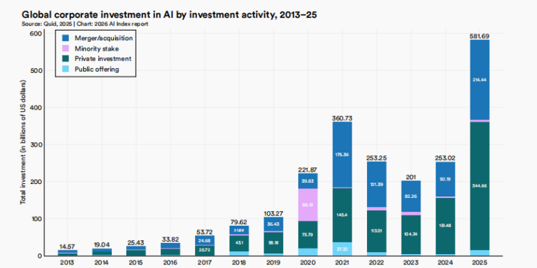 ▲2013–2025年按投资活动划分的全球企业人工智能投资总额