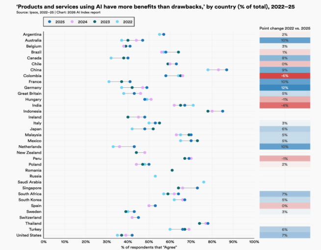 1.AI乐观情绪在上升,焦虑情绪亦然:全球认为AI产品和服务利大于弊的受访者比例从2024年的55%升至2025年的59%,同期表示对AI感到紧张的比例也升至52%。