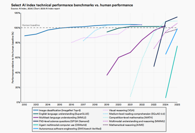 《2026年人工智能指数报告》的核心主题是:AI的能力增长已超出围绕它建立的各类系统的跟进速度。基准饱和、安全事故增多、劳动力影响开始显现、治理框架仍在探索中、公众信心碎片化——这一系列现象共同描绘了一个技术先行、制度滞后的时代图景。