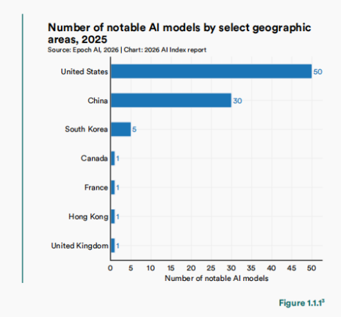 ▲按选定地理区域划分的知名人工智能模型数量(2025年)