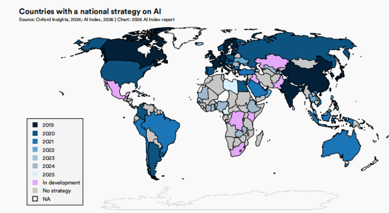2025年是全球AI政策分歧最为凸显的一年:欧盟AI法案第一批禁令生效,美国转向放松监管,日本、韩国和意大利各自出台国家AI法律,超过半数的新国家AI战略来自首次进入政策领域的发展中国家。AI主权作为核心组织原则在全球范围内涌现。