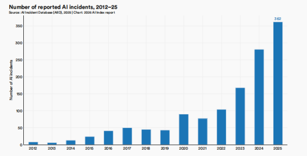 几乎所有前沿模型开发者都公布能力基准测试结果,但负责任AI基准的报告仍零散稀少。AI Incident Data base记录的事故数量从2024年的233起上升至2025年的362起。研究表明,提升安全性等某一负责任AI维度往往会损害准确性等其他维度。