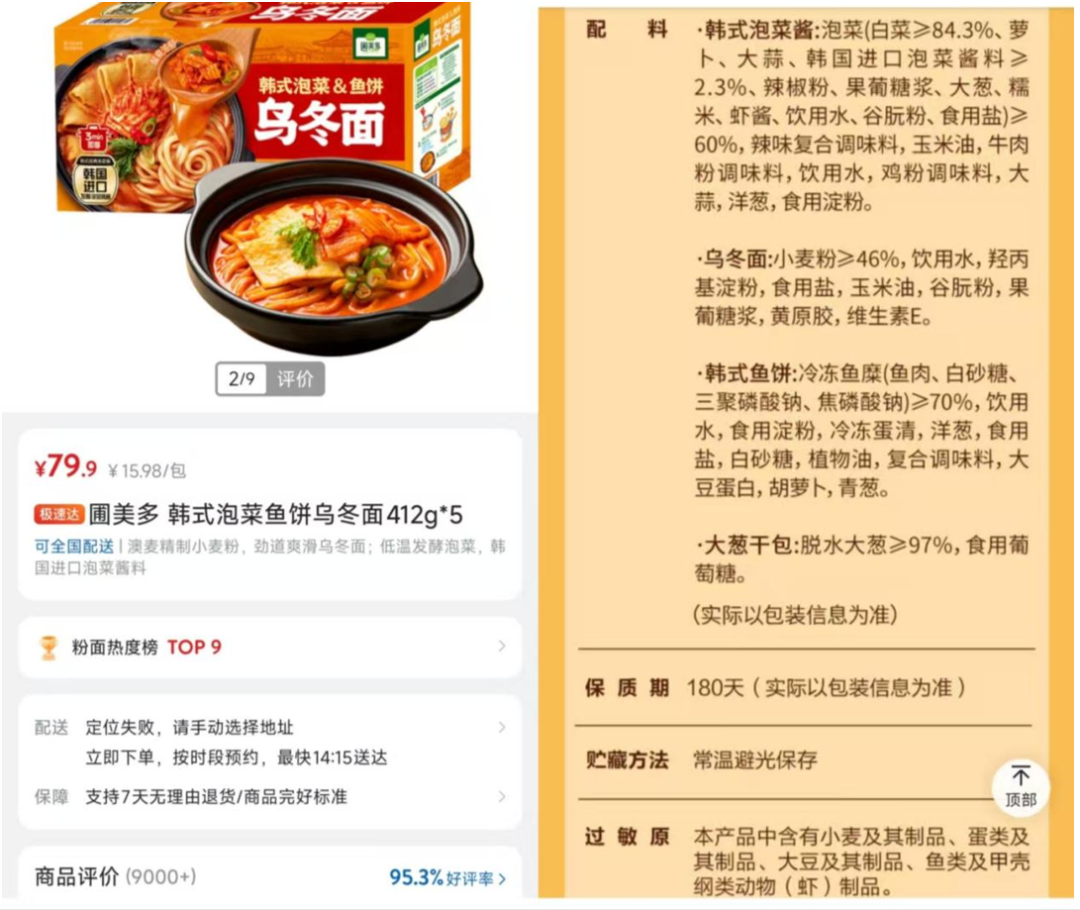 《BUG》栏目在山姆官方App搜索发现,涉事产品为“圃美多韩式泡菜鱼饼乌冬面”,拆开后里面有鱼饼、乌冬面和韩式泡菜酱,外包装写着常温保存即可。售价方面,该乌冬面5袋组合包装为79.9元,总重2.06kg,内有五包,单包平均15.98元。截至目前,“圃美多韩式泡菜鱼饼乌冬面”仍正常销售,并未下架整改。