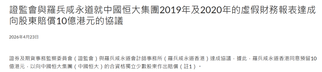 本文来自微信公众号: 财通社 ,作者:财通社,原文标题:《恒大财务造假余波未了!普华永道香港被罚3亿,还要拿10亿赔股东》