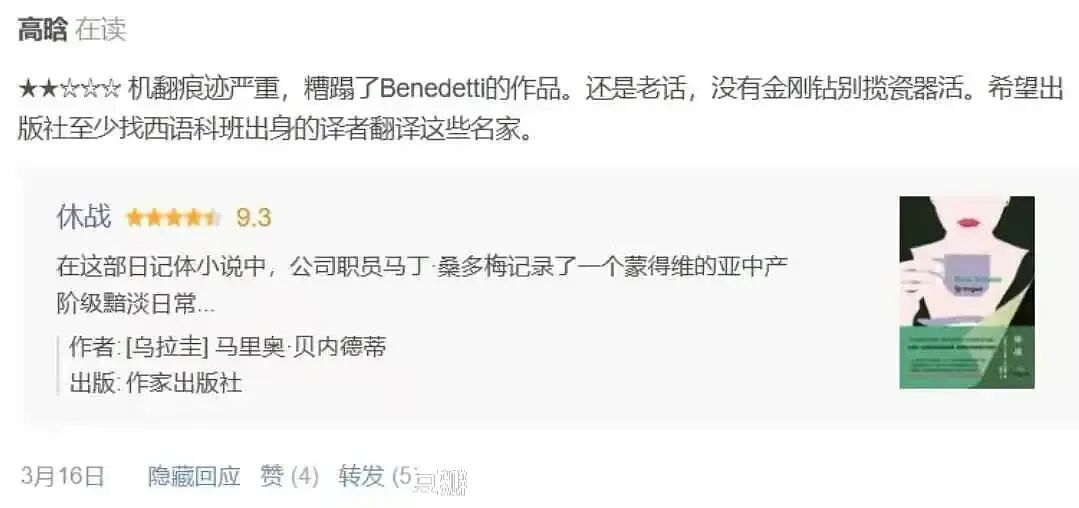 “友邻好。Benedeti是我非常喜欢的作家,这本书的每句话都是认真翻译的,前后校对修改过很多遍。我能力有限,自知无法还原原文的风采,但是希望能多的人能读到这本我喜欢的书,翻译时也尽了自己最大的努力,不足之处请你多多指正,但看到‘机翻痕迹严重’几个字真的觉得不公平。”
