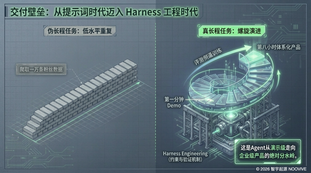 袁薇(阶跃星辰)从基础模型能力演进的角度呼应了这一判断,将AI发展分为三个阶段:提示词工程时代、上下文工程时代,以及当下的Harness Engineering(AI的"安全带与脚手架",确保Agent稳定完成任务的约束和验证机制)时代。她的判断一针见血:"AI的赛事已经从模型本身转向了构建更完善的外部环境。"从"会回答"到"会交付"的关键跨越,Harness正是Agent从演示级Demo走向企业级产品的"绝对分水岭"。