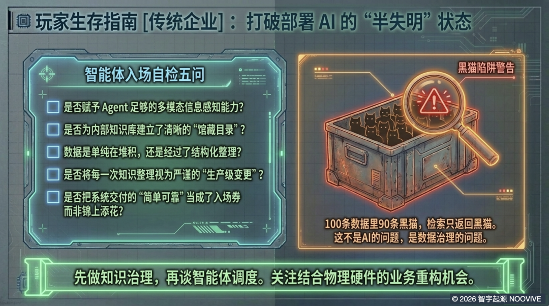 真正的切入点:不是从Agent开始,而是从数据和知识体系开始。李博杰的比喻极其精准:"100条数据里90条黑猫10条白猫,Top-K检索永远只返回黑猫。"如果你内部的数据和知识是"黑猫堆",Agent只会给你返回更多"黑猫"——这不是AI的问题,是你的数据问题。先做知识治理,再做Agent部署。