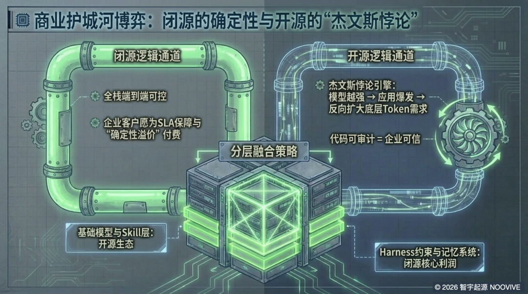 开源与闭源不是二选一,而是分层策略。王宁的"杰文斯悖论"暗示:开源基础模型会催生更多应用,而非杀死大厂生意。聪明的策略可能是:基础模型开源(占生态位),核心Harness和记忆系统闭源(赚利润)。姚霆的洞察也印证了这一点——Skill层的价值在于"可共享、可复现",天然适合开源;而编排和约束机制则需要深度优化,适合闭源。