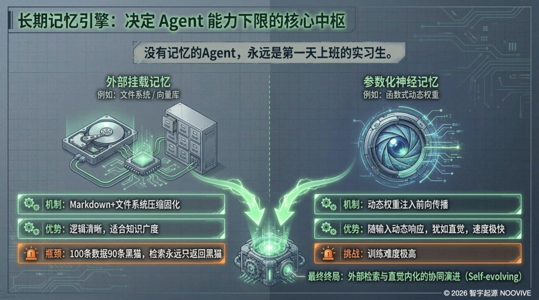 两个方向的差异在于:外部记忆系统像计算机的"外存",逻辑清晰但检索有瓶颈;参数化记忆像人类的"直觉",响应极快但训练难度极高。但从趋势看,两者并非互斥——正如人类既有直觉反应,也有回忆检索,两条路径的协同可能是更合理的终局。