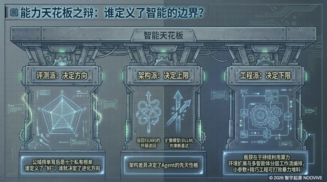 三种视角的根本差异在于对"AI能力边界"的归因方式不同:评测决定论认为能力边界由"你怎么定义和测量"决定发展方向;架构决定论认为由"信息处理的数学结构"决定;工程决定论认为由"如何系统化地组织能力"决定。现实中三者可能各对了一部分——评测决定方向,架构决定上限,工程决定下限。