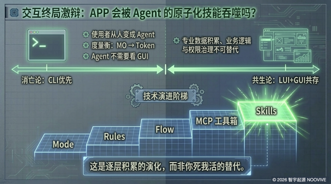 Agent时代,用户交互的基本单元会不会从APP变成原子化的Skills(AI的"小技能",类似手机APP的单一功能)?"消亡论"认为APP将被Agent编排的Skills彻底取代;"共生论"认为两者将长期共存、各司其职。