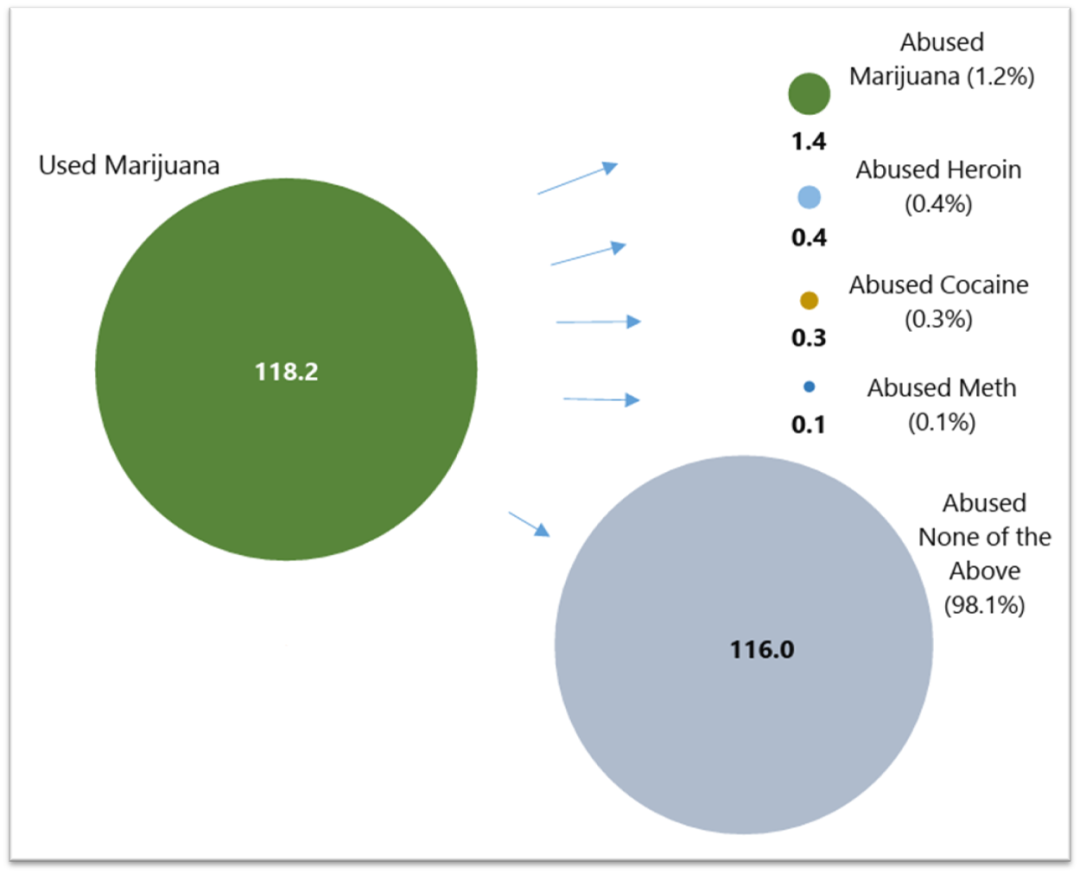 比如美国司法部引用的一项2018年研究估计1.12亿12岁以上美国人曾用过大麻,里面32%尝试过可卡因,12%尝试过冰毒,4%试过海洛因。而对其它毒品上瘾的人很更少,只有0.3%的人滥用海洛因,可卡因是0.2%,冰毒是0.1%。其实滥用大麻的都很少,只有1.4%。