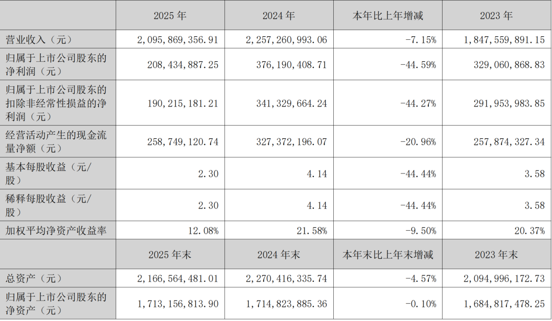 根据日前披露的最新年报,2025年甘源食品实现营业收入20.96亿元,同比下滑7.15%;实现归母净利润2.08亿元,同比骤降44.59%;实现扣非净利润1.90亿元,同比下滑44.27%。