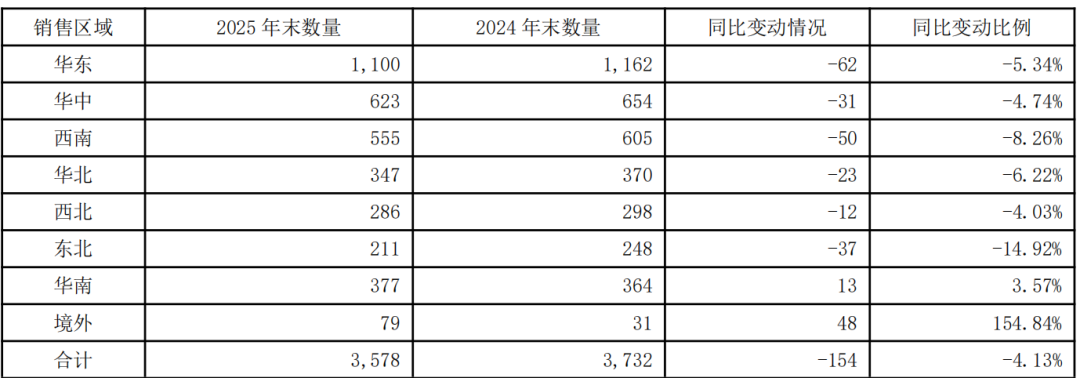 财报显示,截至2025年末,甘源的经销商总数为3578家,较2024年末的3732家净减少154家。但事实上,剔除新增的48家海外经销商,甘源食品2025年在国内净减少的经销商数量总计202家。