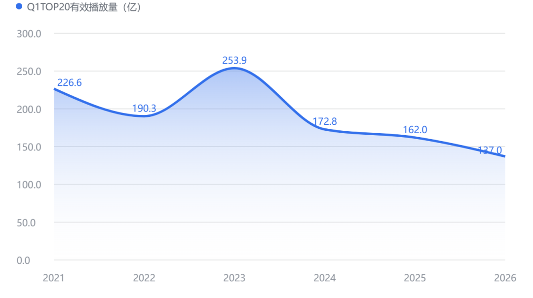 2026年第一季度,全网TOP20的剧集正片有效播放量为137亿。