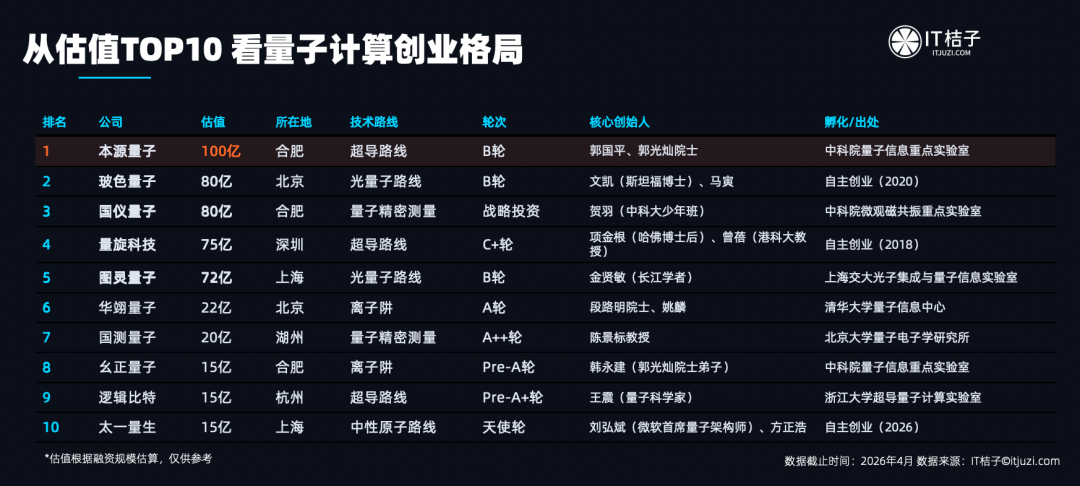 据IT桔子数据,截至2026年4月,中国量子计算赛道已追踪到92家公司,其中估值最高的10家企业合计估值超过490亿元,占据行业总估值的绝对大头。