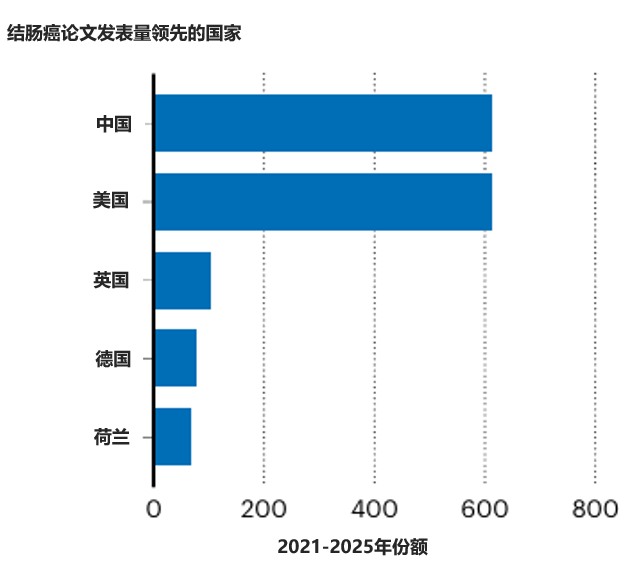 在2021年至2025年*的结直肠癌相关产出的指数中,中国与美国之间的差距不到1个份额百分点。英国、德国和荷兰位列该癌症相关产出排名前五。