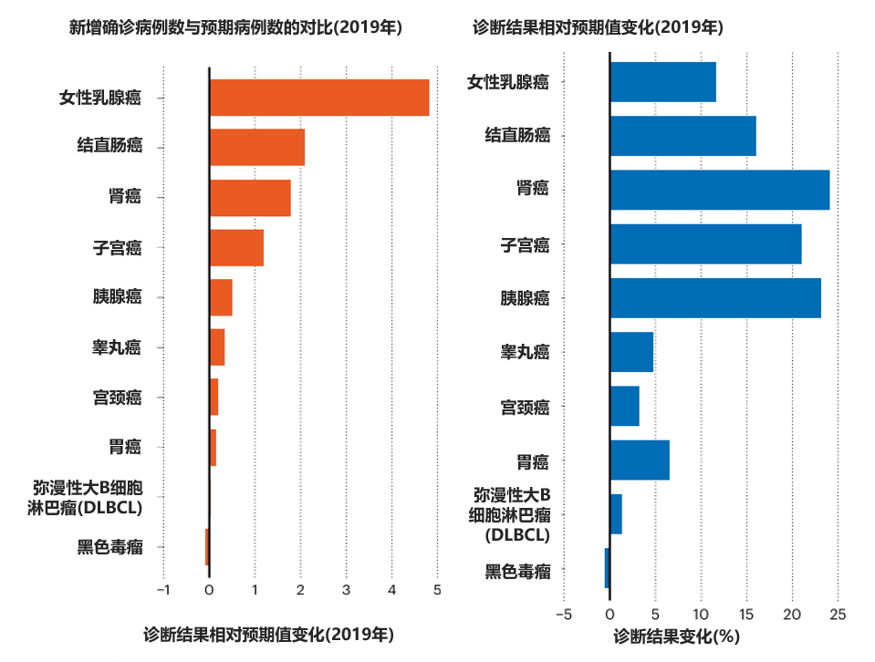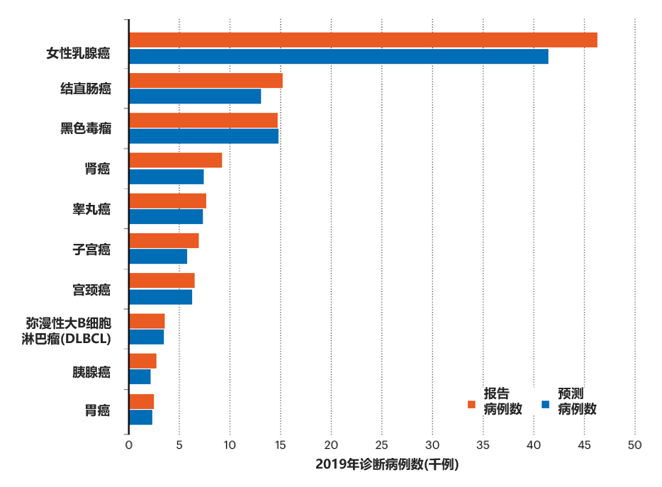以绝对值和百分比的形式展示了2019年美国50岁以下人群癌症确诊病例数与预期病例数的对比情况。黑色素瘤是唯一一种病例数低于预期的癌症。