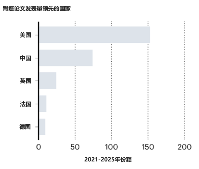 与乳腺癌和结直肠癌相比,肾癌在2021年至2025年*的指数中所占份额相对较小。在肾癌相关病例数排名前五的国家中,美国位居榜首,其份额比排名第二的中国高78.49%。