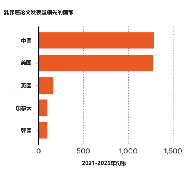 在《自然》指数中,发表乳腺癌相关论文的国家中,中国和美国并列第一,在2021年至2025年期间的份额几乎相同*。在所有癌症类型中,乳腺癌在这一时期的指数份额最高。