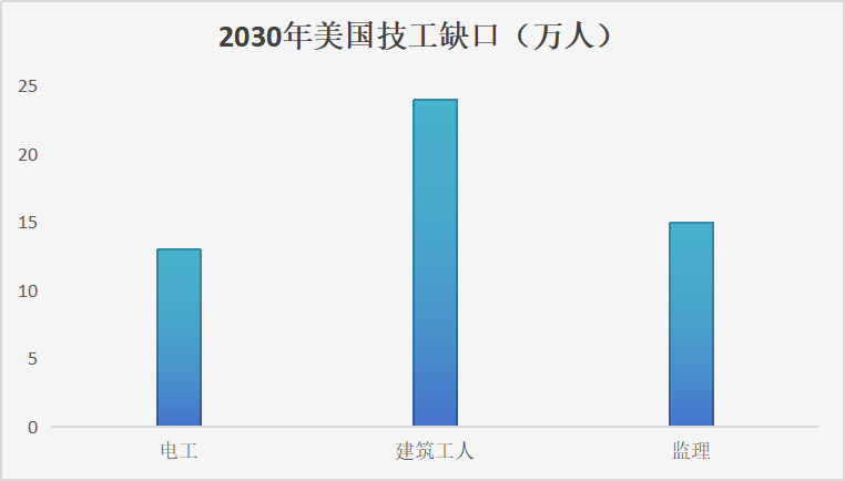 根据麦肯锡的估计,到2030年,美国会缺少13万电工、15万监理和24万建筑工人。
