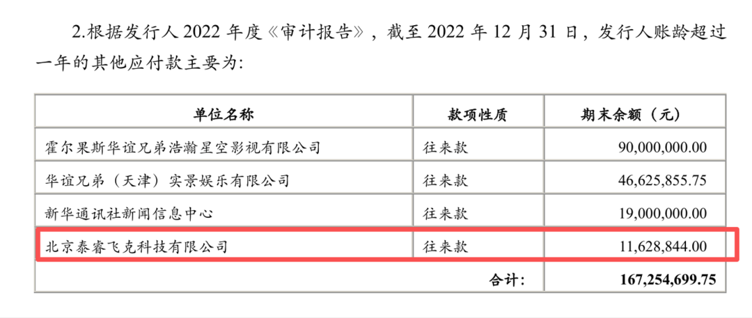 《BUG》栏目注意到,华谊兄弟欠款源于此前双方的广告合同纠纷,金额约1140.5万元。根据一份律所文件,截至2022年末,华谊兄弟对泰睿飞克的应付款账龄已超过1年,这意味着至今这笔款项逾期约5年时间。