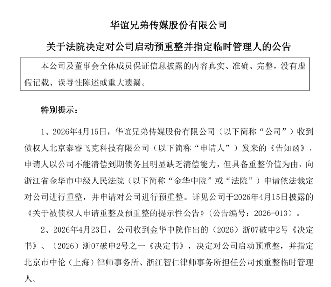 根据华谊兄弟的公告,法院正式受理债权人北京泰睿飞克科技有限公司(以下简称“泰睿飞克”)对华谊兄弟的重整申请,启动预重整程序并指定临时管理人。