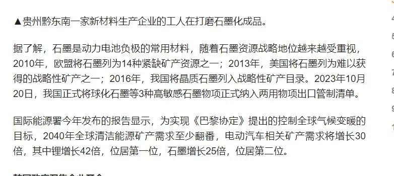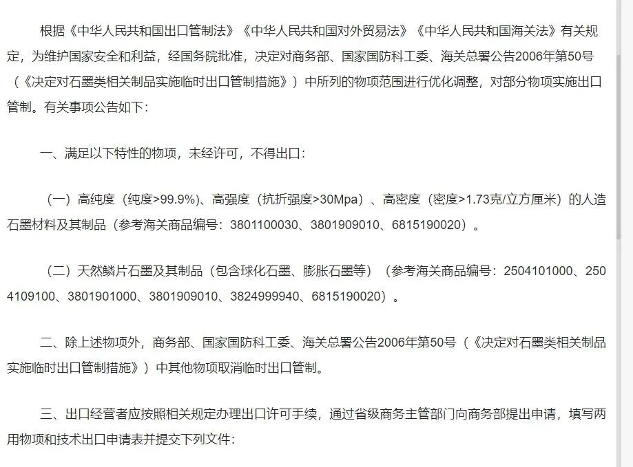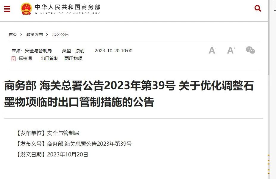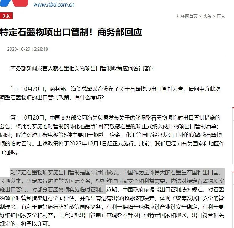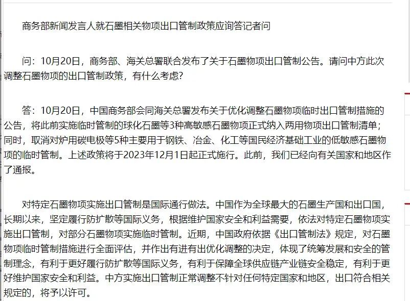 我国商务、海关总署在2023年10月20日发布关于“优化调整石墨物项临时出口管制措施”的公告。当时,商务部新闻发言人曾表示,对特定石墨物项实施出口管制是国际通行做法。中国作为全球最大的石墨生产国和出口国,长期以来,坚定履行防扩散等国际义务,根据维护国家安全和利益需要,依法对特定石墨物项实施出口管制,对部分石墨物项实施临时管制。