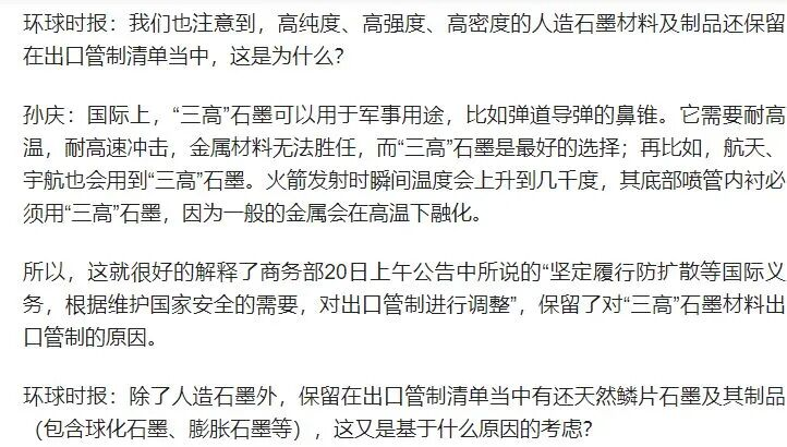 此外,中国炭素行业协会名誉会长孙庆2023年接受媒体采访时曾表示,在国际上,“三高”(高纯度、高强度、高密度)石墨可以用于军事用途,比如弹道导弹的鼻锥,航天、宇航也会用到“三高”石墨。