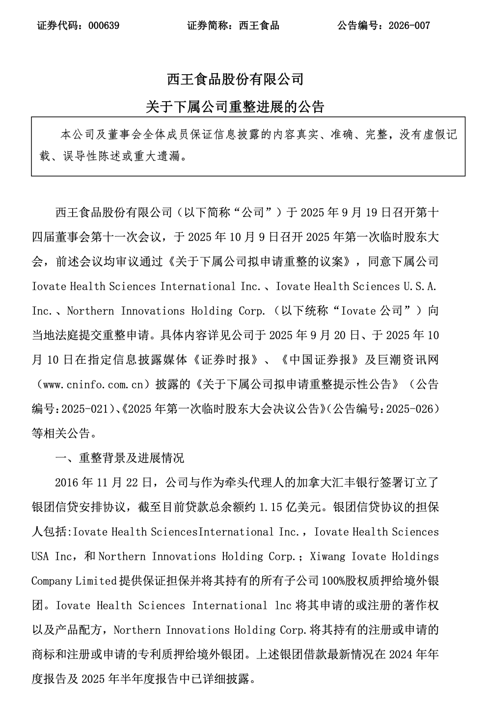 2025年10月底,西王食品向当地法院递交了下属子公司Iovate的重整申请。其4月21晚间的公告显示,经多轮筛选与谈判,通过竞拍方式,监管人于当地时间4月2日选定1001542267 Ontario Inc.为中标方并签署《认购协议》。当地时间4月16日,加拿大法院对该交易方案确认批准。待当地时间5月6日美国法院听证通过即可完成交割。