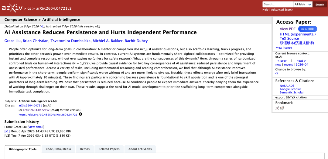 最近,卡内基梅隆大学、牛津大学、麻省理工学院和加州大学洛杉矶分校的研究团队联合发布了一项研究,通过三组随机对照实验,找来共计1222名受试者,系统地测量了AI辅助对人类独立解题能力的影响。