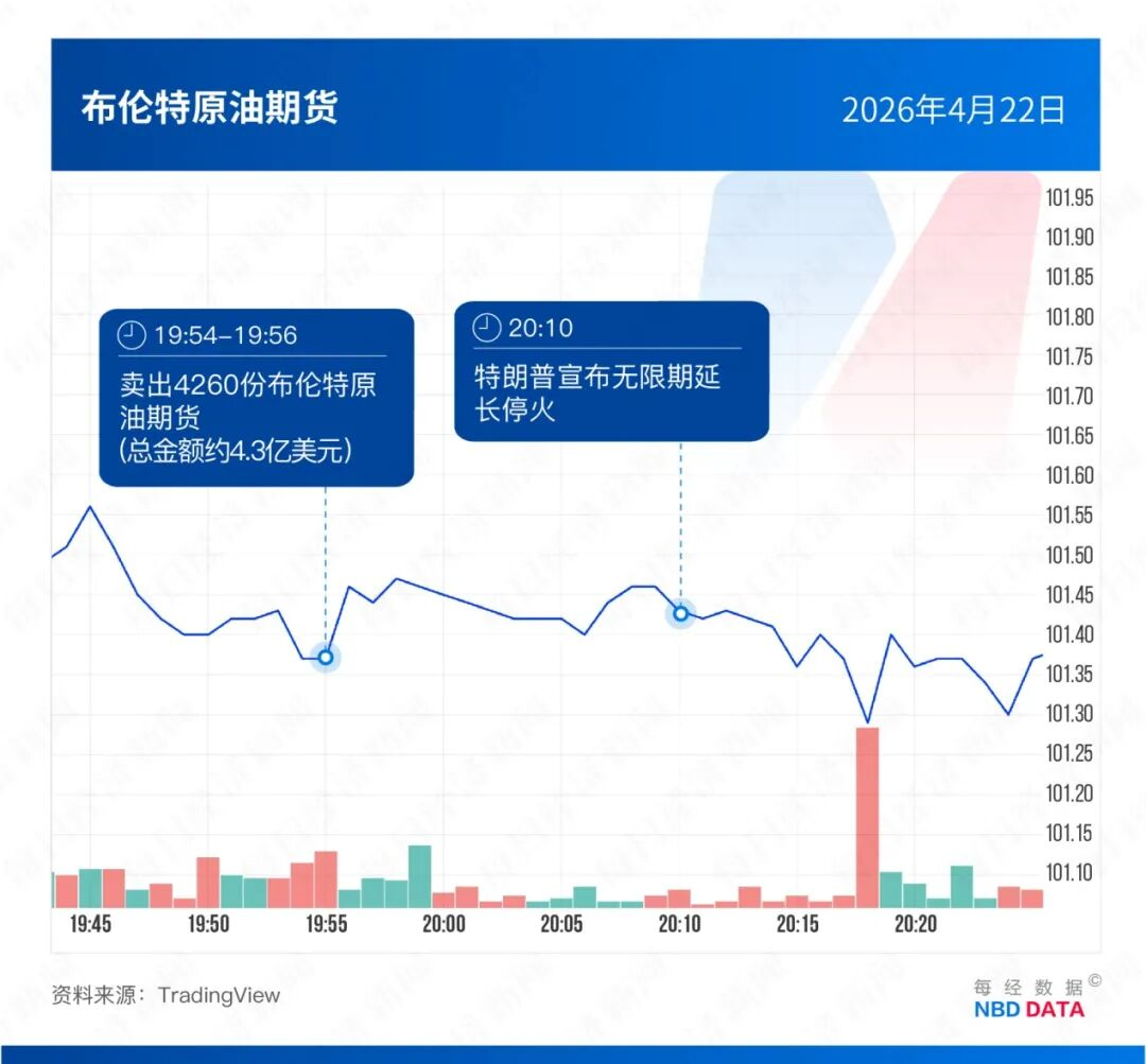 特朗普宣布“与伊朗达成两周停火”前约2小时45分钟,原油期货合约被大规模卖出。