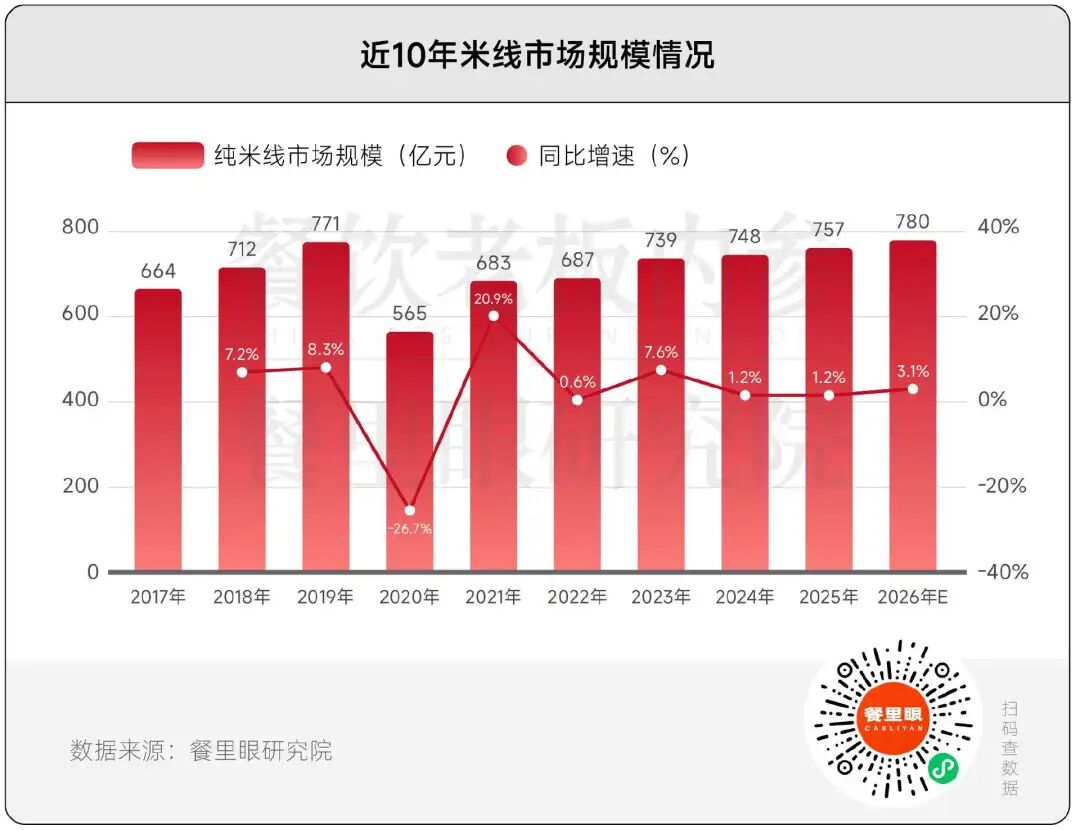 餐里眼研究院数据显示,2023-2025年米线行业彻底进入稳步增长阶段,预计2026年市场规模稳健增至780亿元。