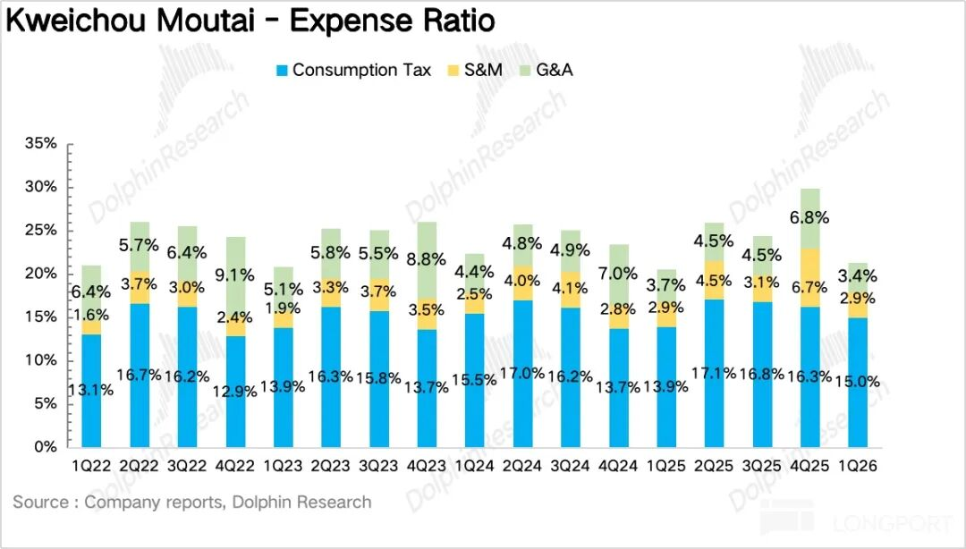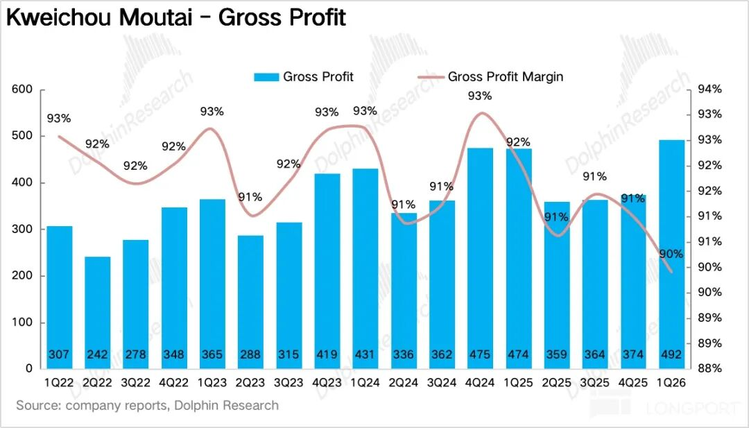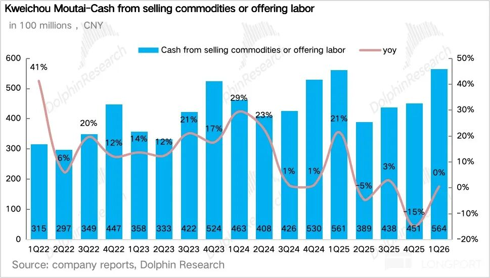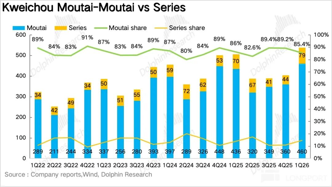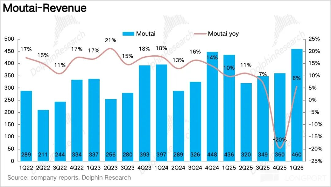如果拆产品看,一季度最大的变化毫无疑问来自茅台酒,尤其是飞天。1Q26茅台酒实现营收460亿元,同比增长5.6%。