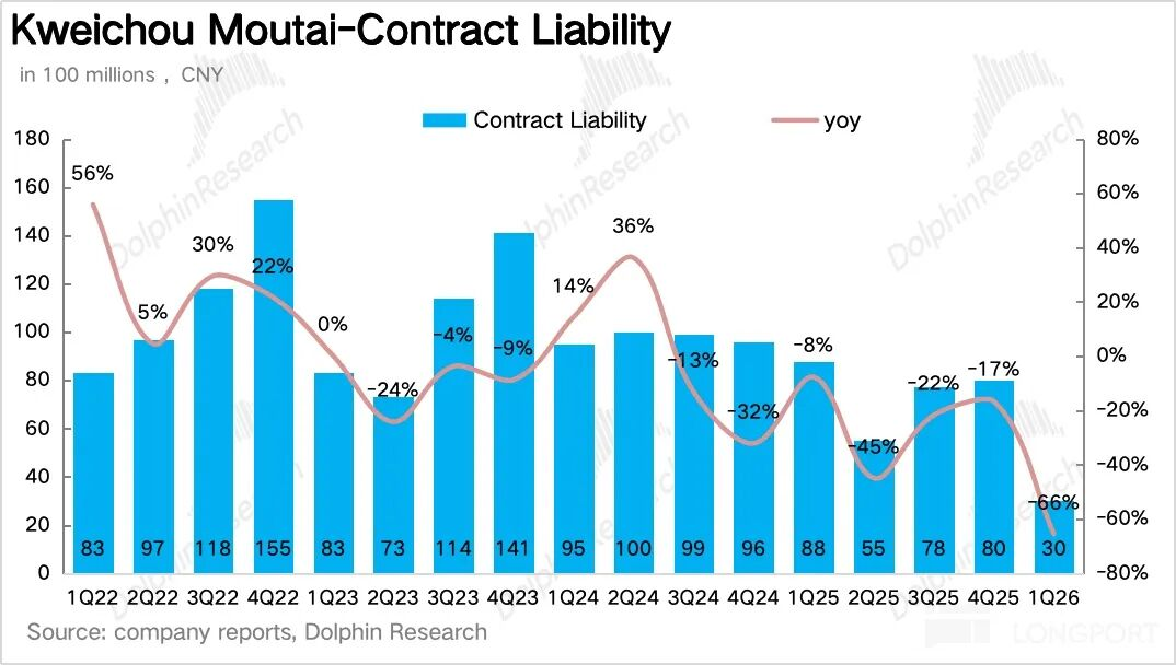 从“蓄水池”合同负债项看,截至一季度末茅台合同负债为30亿元,同比下降66%,一方面是由于直营占比大幅拉高,砍掉了大量预售款基数(i茅台为即时收入,不产生预售款),另一方面,海豚君推测茅台在一季度进一步收紧了对经销商的预售款要求,只收必要的备货款,不再提前锁定大额预售款。