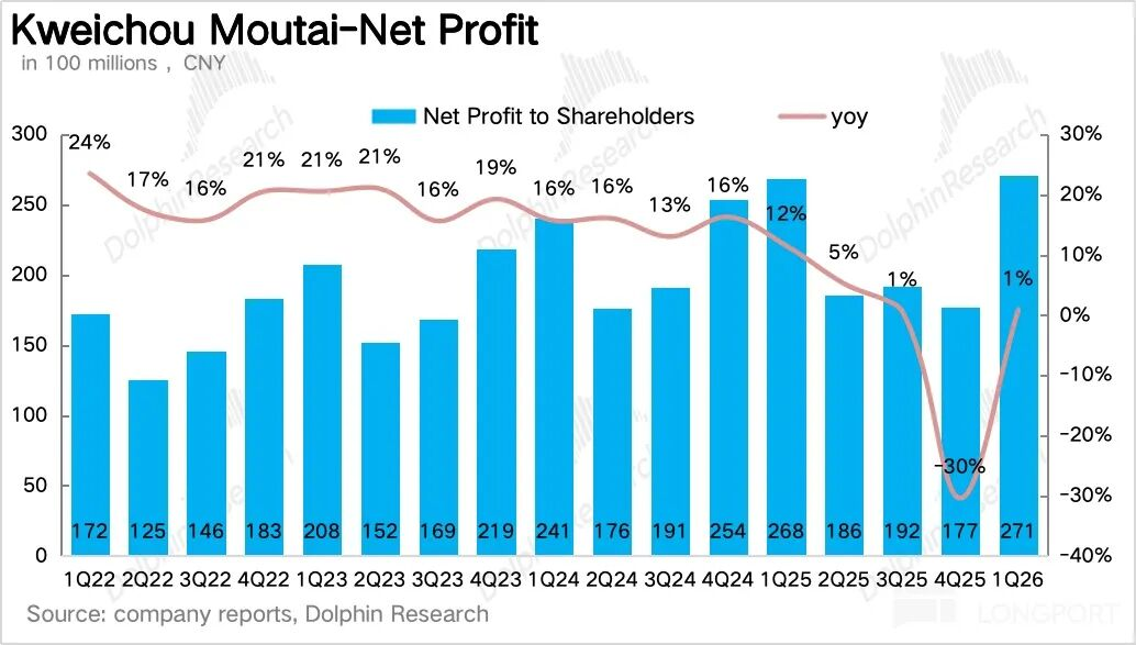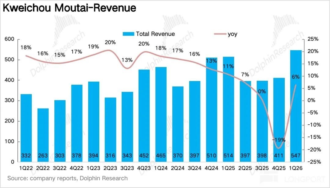 北京时间4月24日晚间,贵州茅台(600519.SH)发布了2026年Q1季度业绩,整体上,作为渠道改革落地后的首份业绩,海豚君认为茅台整体表现还是不错的,在去年同期高基数的情况下收入重回正增长,唯一的瑕疵在于非标酒降价、占比减少的情况下公司利润增速低于收入增速。