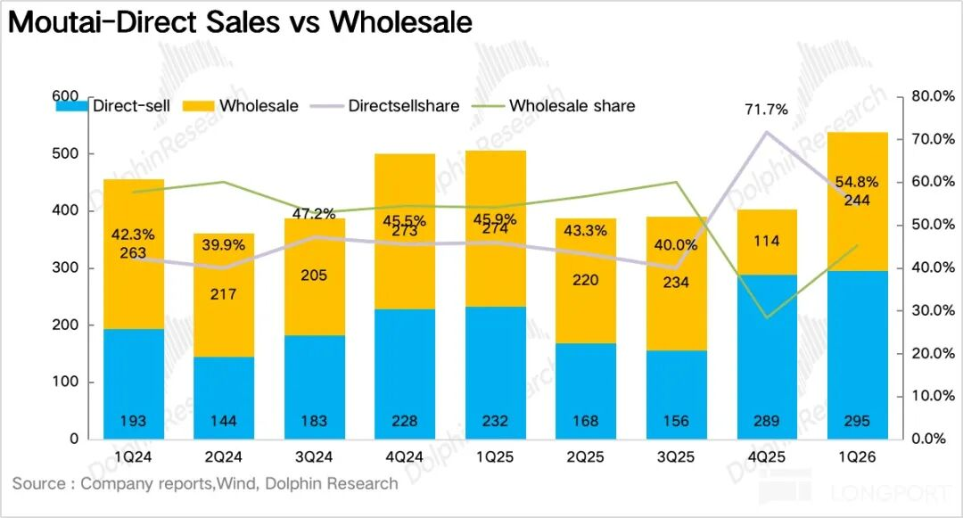如果说产品端最大的变化是飞天回归,那么渠道端最大的变化就是:直销彻底成了主引擎。1Q26茅台直营渠道实现营收295亿元,同比增长27%,其中i茅台实现营收216亿元,占比达到73%。