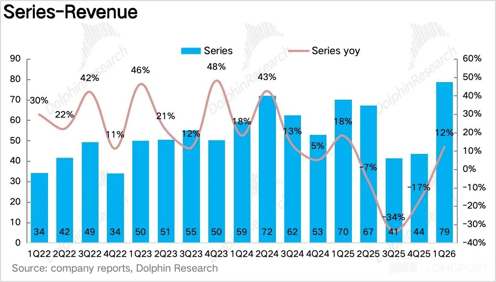 1Q26系列酒实现营收79亿元,同比增长12.2%,经过去年Q3、Q4连续两个季度的报表出清后重新回归双位数增长。