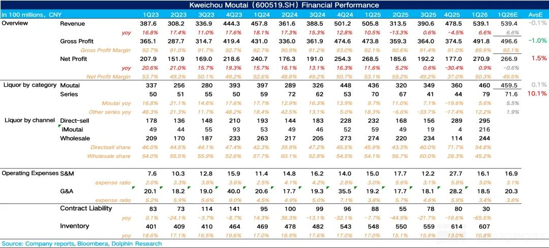 1Q26茅台共实现营收539亿元,同比增长6.6%,在经历了去年下半年为了稳批价、腾挪渠道、给2026年市场化改革让路而做的主动牺牲,一季度迎来了报表端的第一个拐点。