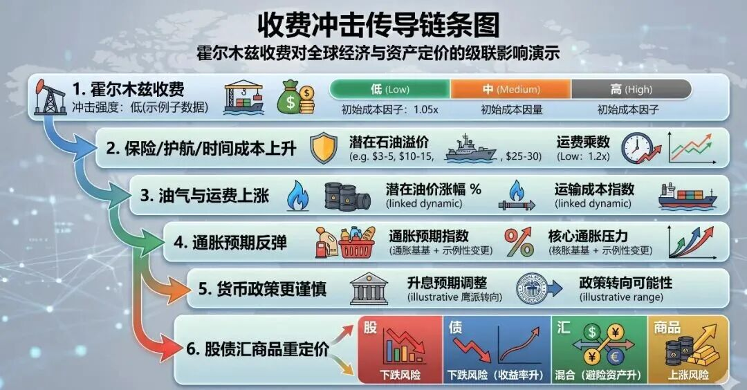我最想提醒的一点是,不要把霍尔木兹收费只看成“原油新闻”。真正要看懂的是整条链:海峡收费→运输与保险成本上升→油气与运费上涨→通胀预期抬升→利率路径变化→股债汇商品重新定价。