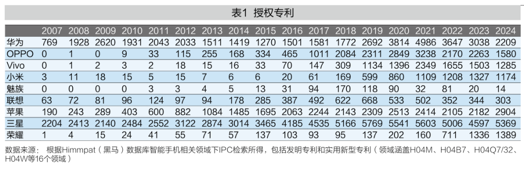 这类企业非常注重核心技术的长期积累。例如,华为长期坚持这一战略路径。根据黑马数据库智能手机领域相关检索结果,2007—2024年间华为多数年份的专利申请量显著高于国内同业企业,2019年起多个年份专利授权规模更是超越了苹果公司(见表1)。这体现了华为在增强技术实力方面的不懈努力。华为选择专注于核心技术(产品技术构建)而非市场洞察的手机业务战略有以下原因:首先,华为原来的业务主要集中在通信设备领域,在进入手机业务之前,也从事过半导体芯片设计业务。这段历史强烈影响了华为在手机业务早期对核心技术的重视。其次,在2010年以前,华为手机基本以运营商定制机(业内俗称“白牌机”)的形式存在,与三大运营商深度捆绑而不是直接面向消费者,这种B2B导向决定了该公司对市场洞察和信号的敏感度较低。这与OPPO等以市场洞察为导向的企业不同,OPPO等手机业务以B2C为导向,强调市场信号和机会。华为在2011年转型后,开始真正加强关注消费市场导向。从B2B向B2C模式的转型,需要在产品设计与产品开发思维上做出转变,这要求企业学习品牌建设、客户互动、与渠道伙伴合作并捕捉市场信号等能力。这些努力需要时间的积累,导致华为早年对市场洞察和信号的敏感度较低。最后,华为遵循“自给自足”的理念,将自研芯片率先应用于自家手机产品并快速迭代。2012年左右,华为决定在其手机中使用其自主开发的麒麟K3V2半芯片,在此之前,华为在手机业务发展初期主要使用其他品牌芯片组。由于缺乏手机芯片研发经验,这款芯片的质量和性能相对有限,搭载该芯片的早期产品也因性能不佳、功耗高、软件兼容性差遭受市场诟病。但华为始终将内部试错视为芯片技术改进的关键,持续迭代自研芯片并应用于智能手机。这种策略虽让华为在一定程度上分散了对市场变化和新信号的注意力,却倒逼其集中精力攻坚芯片技术升级,为后续发展积累了宝贵经验。2014年,华为推出搭载更先进麒麟925芯片的Mate7手机,凭借出色的芯片性能和综合产品力大获成功,成功跻身中高端市场,其自主设计的芯片也逐步获得市场广泛认可。
