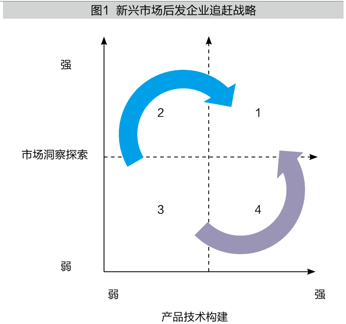 后发企业追赶并超越现有企业有两条基本的战略路径:一条是“市场洞察先行”路径,如小米、OPPO等企业,先聚焦市场痛点挖掘新机会,再通过技术合作将洞察转化为产品,快速实现创新追赶;另一条是“技术积累后发”路径,如华为等企业,先深耕核心技术储备,再逐步强化市场洞察能力,成为新商机的快速响应者,最终实现技术优势与市场需求的深度结合,这为有一定技术基础的后发企业提供了另一种有效选择。两条路径最终体现的是高市场洞察力与高产品技术的结合。