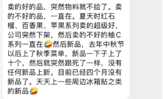 这不是个例。一位自称开了幸运咖两年的老板也表示,夏天的多个产品明明销量很好,但是公司突然下架,后续更是出现了四个月的“停更”。