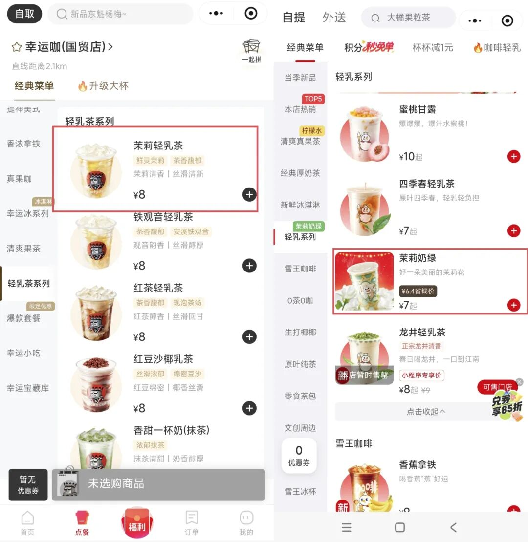 比如蜜雪冰城和幸运咖的核心竞争力都是性价比。但类似的产品,更贵的经常是幸运咖。以同样在北京国贸附近的两家门店作为对比,在小程序上,幸运咖的茉莉轻乳茶比口味相似的茉莉奶绿贵了1元。这不是个例,其他产品,双方的价格也总是不一致,而更贵的经常是幸运咖。