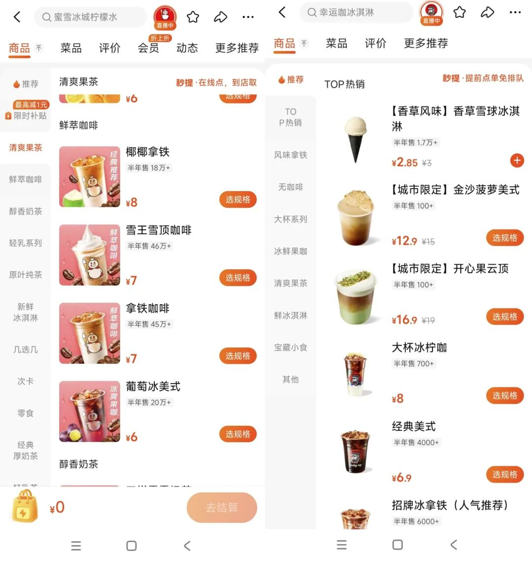 两家都通过冰淇淋制品引流。幸运咖有香草冰淇淋,而蜜雪冰城也有原味冰淇淋;幸运咖有草莓圣代,蜜雪冰城也有草莓摇摇奶昔。