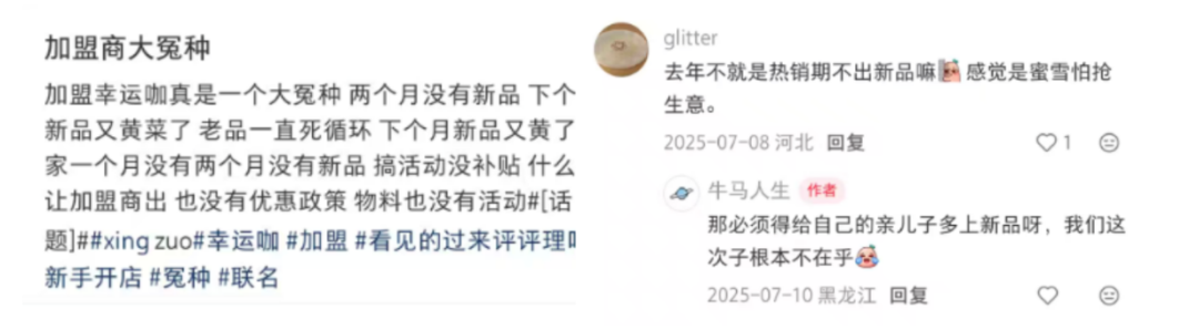 还有网友在夏天表示,该地区的幸运咖一度两个月都没有推出新品。彼时是奶茶的热销期。而这次反常的停更也被网友理解为,蜜雪冰城担心幸运咖抢生意,逼幸运咖让步。