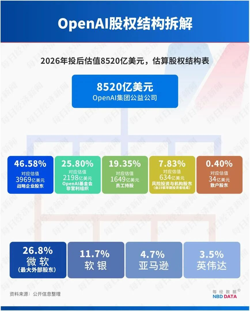 2026年3月31日,OpenAI完成新一轮融资,获得1220亿美元承诺资本,估值达8520亿美元,并首次向散户开放认购,创下硅谷融资纪录。当前股权结构显示,OpenAI基金会持股25.8%,微软为最大外部股东,持股26.8%。