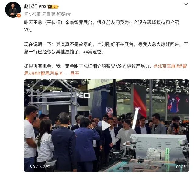 直到车展次日,赵长江才无奈发文回应:“当时刚好不在展台,等我火急火燎赶回来,王总一行已经移步其他展馆了,非常遗憾。”