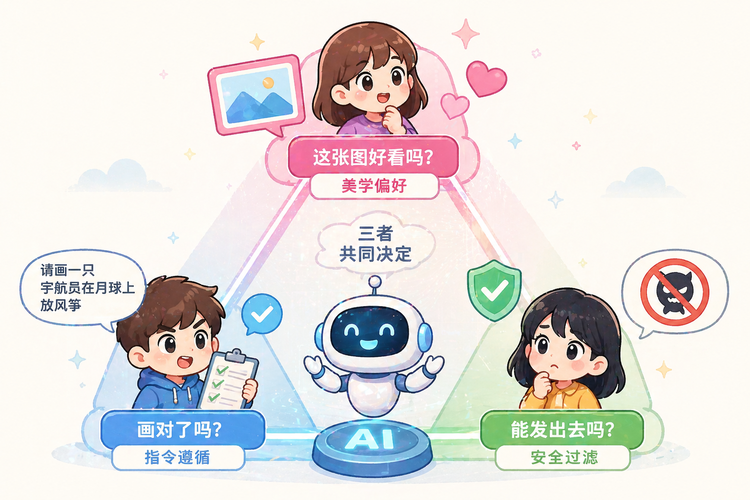 但在图像侧,难度骤升。因为质检员需要同时盯住三条线:美学偏好;指令遵循;安全过滤。